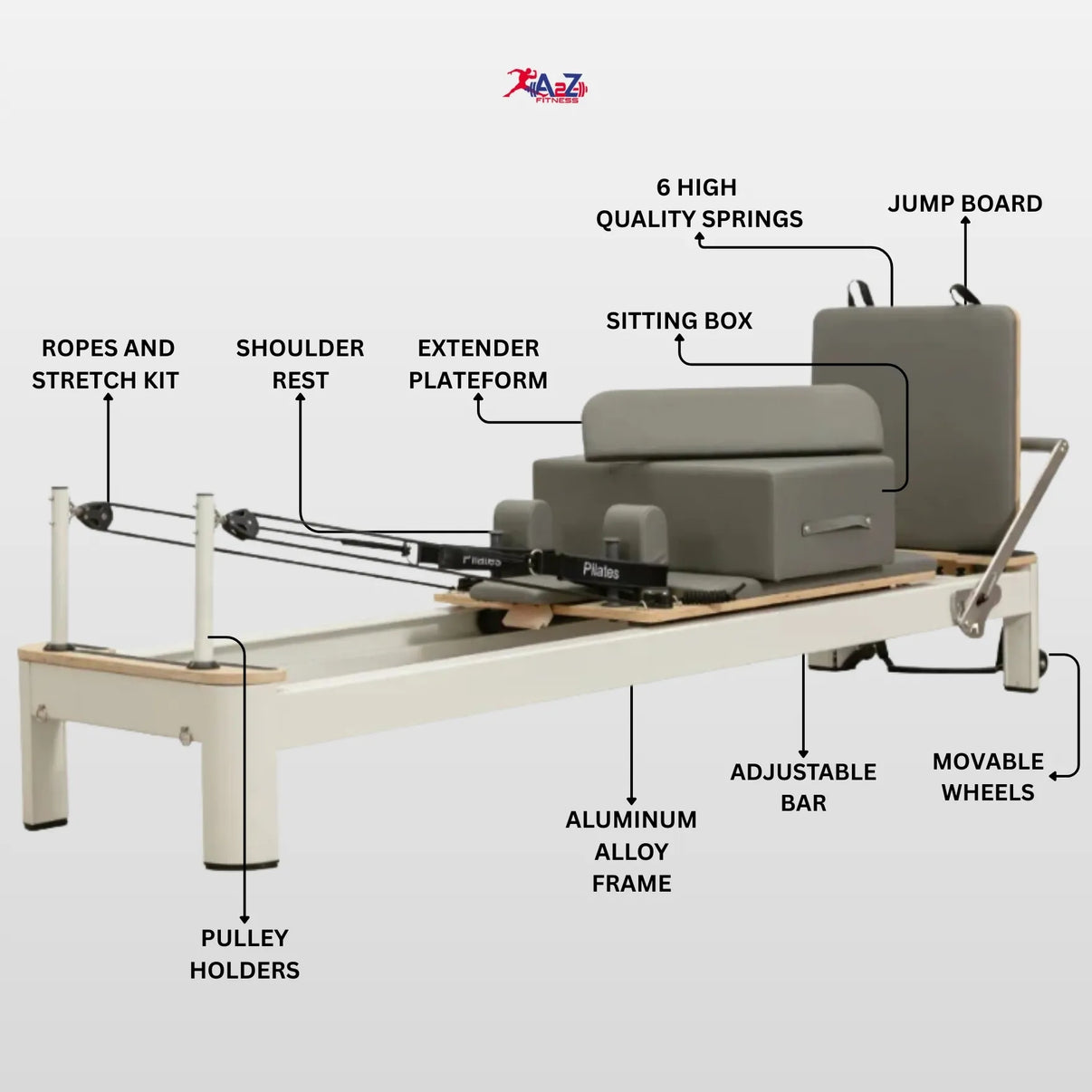 Our Studio Aluminium Reformer is just the ticket for your gym gear Brisbane setup. This beauty is built tough with a lightweight aluminium alloy frame, offering awesome durability and a sleek, modern look. It's perfect for a home or studio, ready to elevate your fitness journey with style and function.
