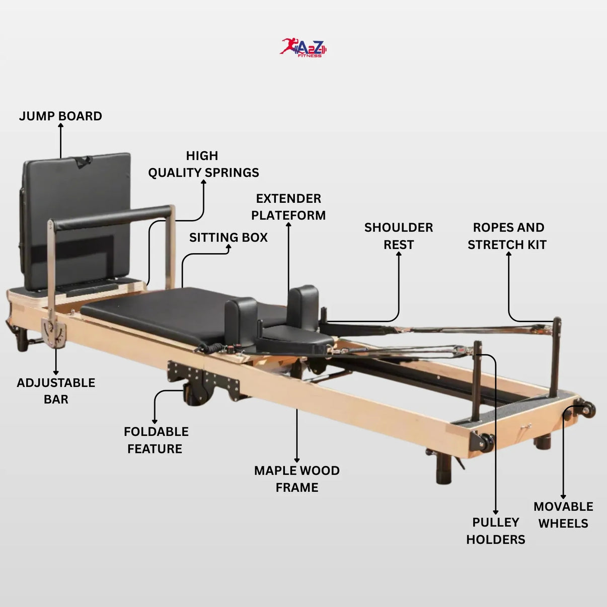 Ready to seriously boost your fitness? Our awesome Maple Wood folding reformer Pilates set is just the ticket! This premium all-in-one package gives you a dynamic full-body workout, perfect for anyone. Its beautifully crafted Maple wood frame is super tough but also looks amazing, fitting right in with any space.